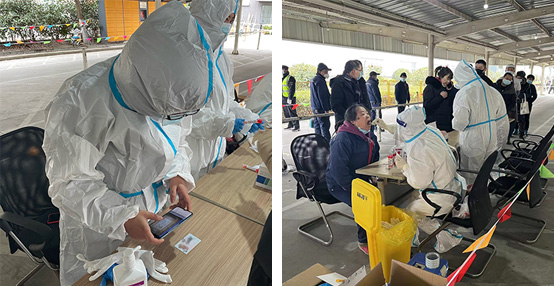 采样现场,标本采集人员严格按照核酸采样要求,身穿防护服、护目镜等全套防护装备严阵以待,待检人员按照要求以各部室为单位,分批分组有序排队查两码、测温、采样、整理。虽然时间紧、任务重,但是所有工作人员依然全力以赴地确保了此次核酸检测工作的高效有序开展,并在采样结束后对现场进行全面消杀。