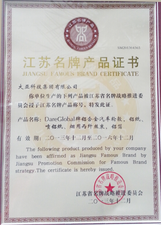 At the middle of March 2014, The Alumium Wheels of DareGlobal gain the Certificate of Jiangsu Famous Brand title.